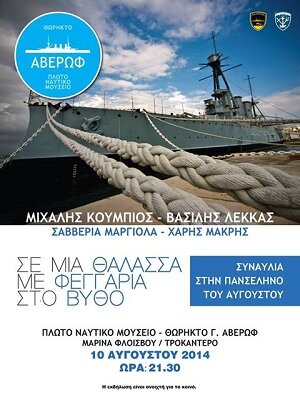 Το Πλωτό Ναυτικό Μουσείο Θωρηκτό "Γ. Αβέρωφ" υποδέχεται την Αυγουστιάτικη Πανσέληνο με μια συναυλία, την Κυριακή 10 Αυγούστου 2014 στις 21.30, με θέμα "Σε μια θάλασσα με φεγγάρια στο βυθό". Στο μουσικό αυτό ταξίδι θα μας συνοδεύσουν ο συνθέτης ...