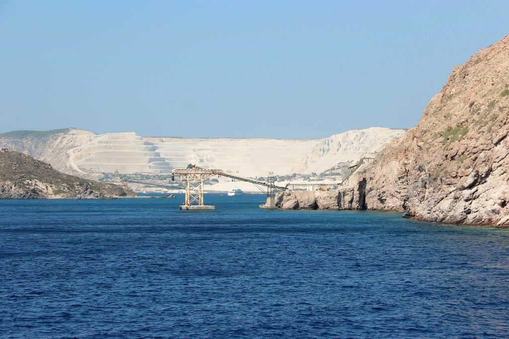 Πληροφορούμαι για την επεξεργασία του υλικού και τη μεταφορά του με ταινίες από το λατομείο στα πλοία, για να συνεχιστεί η διανομή του από το Ισραήλ μέχρι την Βόρεια Ευρώπη και από την Άπω Ανατολή μέχρι τις ΗΠΑ. Η παραγωγή φτάνει το 1 εκατομμύριο τόνους το χρόνο ! Το ορυχείο είναι το πρώτο στο είδος του παγκοσμίως, κυρίως σε εξαγωγές. Ο κύριος Γιώργος, παρά την αφοσίωση που έχει για τη δουλειά του, δεν μπορεί να παραβλέψει το γεγονός ότι μέρα με τη μέρα, κατατρώγεται το νησί με αποτέλεσμα σε 50 χρόνια το μεγαλύτερο ύψωμα να μην ξεπερνά τα 30 μέτρα.
