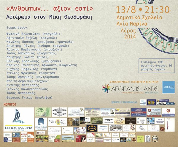 Οι μουσικές και τα τραγούδια του κορυφαίου Έλληνα συνθέτη Μίκη Θεοδωράκη ερμηνευμένα από τις ξεχωριστές φωνές της Αφεντούλας Ραζέλη, της Φωτεινής Βελεσιώτου και του Δημήτρη Πάντου θα πλημμυρίσουν το μαγευτικό χώρο του Δημοτικού Σχολείου της Αγ. Μαρίνας στη Λέρο, την Τετάρτη 13 Αυγούστου, με σκηνικό την πανσέληνο του Αυγούστου, στα πλαίσια του «Φεστιβάλ 3 Φεγγαριών».