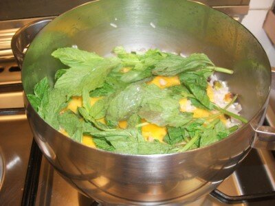 Τοποθετείτε το ρύζι και τους ξηρούς καρπούς σε δυνατή φωτιά για 2 λεπτά, ανακατεύοντας συνεχώς, ζεστό νερό με προσοχή για να μην πιτσιλίσει, σκεπάζετε με ολόκληρα κλωνάρια δυόσμου για να πάρει την μυρωδιά, μόλις εμφανιστούν οι τρύπες στο ρύζι αφαιρέστε τον δυόσμο και καλύψτε την επιφάνεια του ρυζιού με το τυρί...